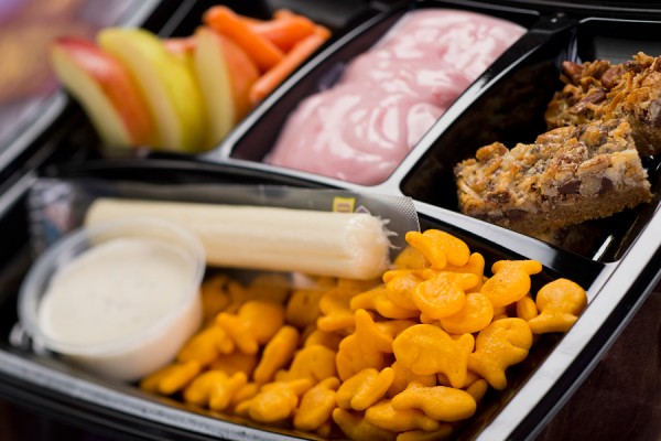 The Kids’ Power Pack Option includes strawberry yogurt, apple wedges, carrot sticks, Goldfish crackers, and an organic apple and cinnamon oatmeal bar.