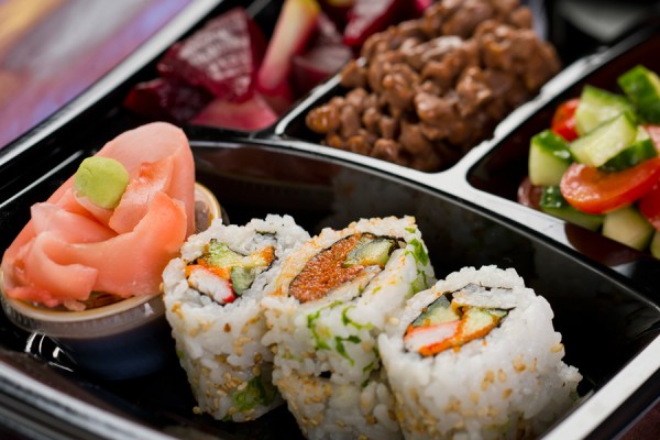 California and tuna sushi roll with beet and apple salad, ginger-marinated tomatoes and cucumbers, and a spicy pecan chocolate cluster.