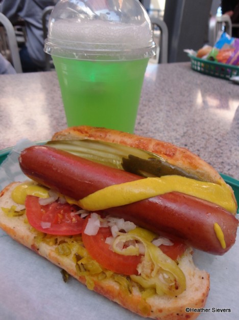 This all beef Kobe, Chicago style hot dog is served “In a Cheddar Poppy Yellow Roll with Dill Pickles, Tomatoes, Onions, Pepperoncinis, and Sweet Emerald Green Relish.”