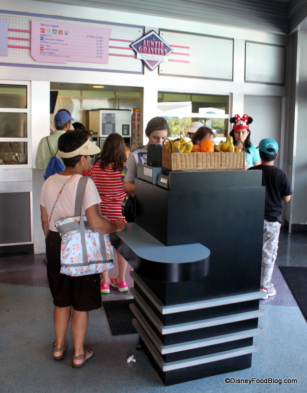 Auntie Gravity’s is located in that thoroughfare that meshes Fantasyland into Tomorrowland. You’ll find this little spot directly across from the Tomorrowland Speedway.