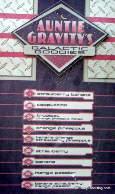 So if you’re searching for Auntie Gravity’s and coming from Tomorrowland, keep a look out for the ginormous “Ice Cream and Smoothies” sign that hangs overtop both doors leading into the shop.