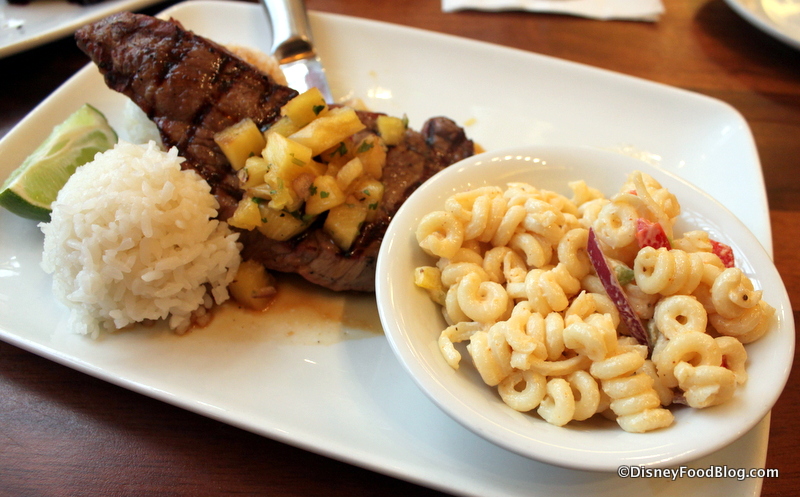 We are big fans of the Hawai’ian Islands, so it’s always a treat to see something on the menu that reminds us of the culture there. Kona Cafe features two lunch items termed as Polynesian Plate Lunches. Both feature Sticky Rice and Pasta Salad as sides. You may choose between Pan-fried Chicken with Coconut and Mango Sauces, or Grilled Teriyaki Steak with Grilled Pineapple Salsa. I went for the latter.