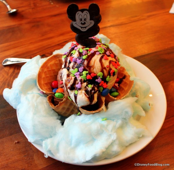 The ice cream sundae is now built within a house made waffle bowl instead of an actual cone — so be prepared if you were used to the old version. It’s still topped with Chocolate Sauce, Mickey Sprinkles, M&Ms, and a Mickey Chocolate Candy.