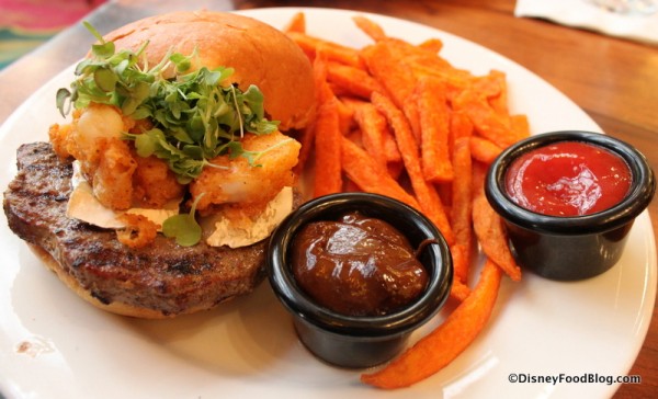 My husband went for the interesting burger option on the menu, the Kona Surf and Turf Burger Deluxe. The burger is served with a side of Sweet Potato Fries.