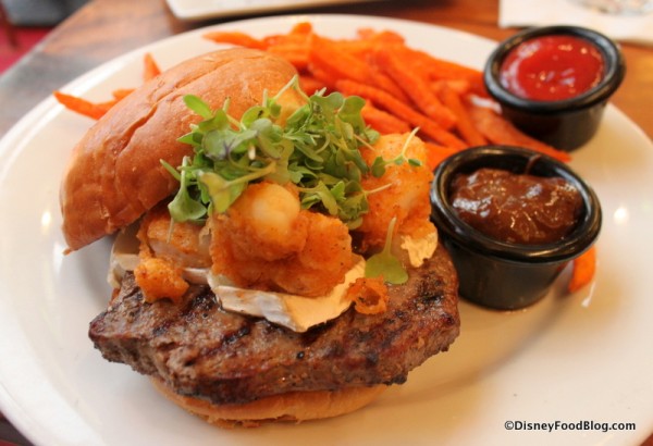 Let’s talk a little about this burger, because it’s completely outrageous! The large Angus Chuck Patty is topped with Brie and Spicy Fried Shrimp. Yes…that’s Brie…and Fried Shrimp. On a burger.