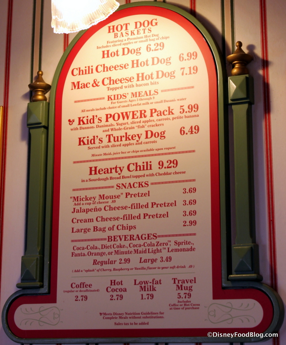 Whether you need a stop to refuel between meals, or you’re looking for lunch or dinner, Refreshment Corner’s small menu offers something for you. The menu is similar to Casey’s Corner in Disney World, with a few noticeable differences.
