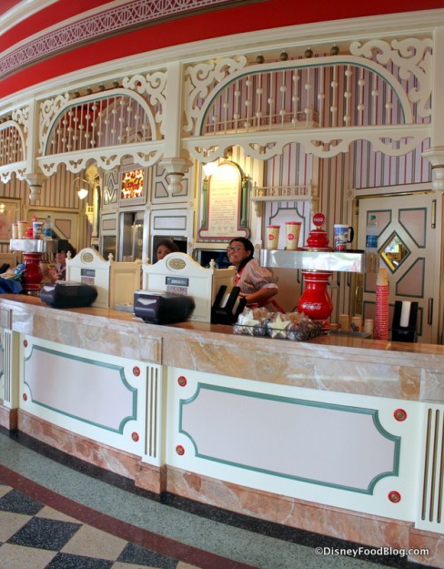 Everything about Refreshment Corner points to the theme of turn of the century Small Town America. And since Coca Cola is the corporate sponsor for the counter service spot, you’ll also see that famous logo throughout the space.