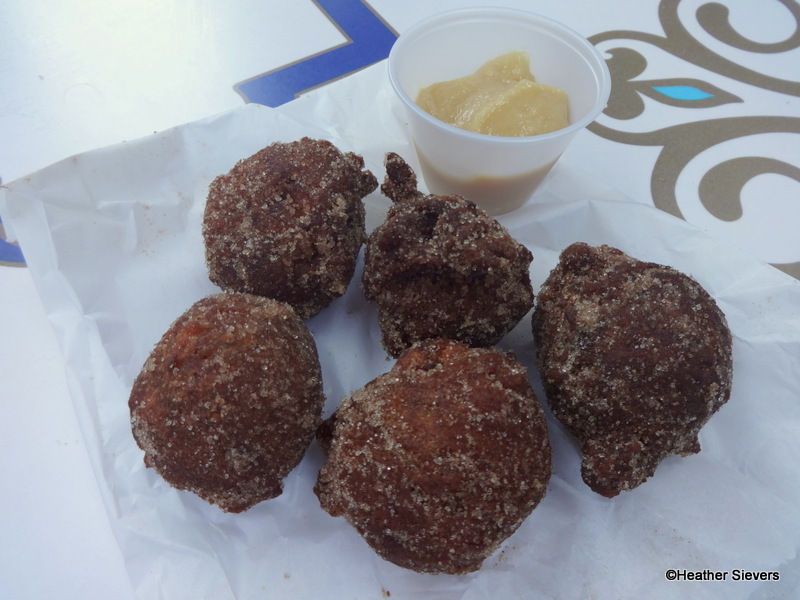 About the size of a donut hole, the fritters are crispy on the outside with a soft center. They’re dusted with a cinnamon sugar sprinkle and served up piping hot.
