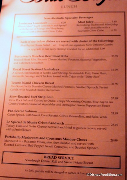 The first thing that you’re likely to notice about the menu is that it is rather small. The second is that it’s pretty pricey. Included with each entree is your choice of either the Blue Bayou House Salad or the New Orleans Gumbo. More about those in a minute.