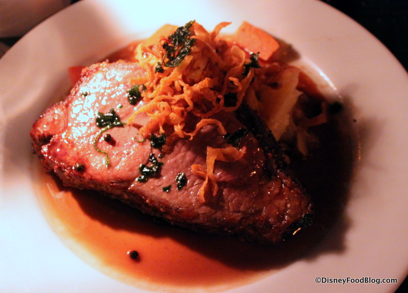 My husband decided to go with the Slow Roasted Beef Strip Loin. The steak came with a side of Au Gratin Potatoes (which were ah-mazing!!) and a garnish of French-Fried Onions. This was fine; but nothing special. It was the side dish that carried the entree.