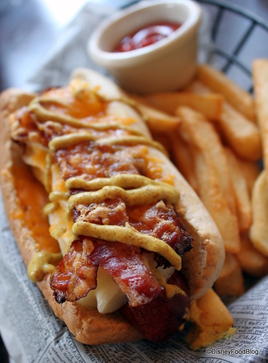 So, how do you make an English Bulldog? Well, you split a banger (that’s a sausage just in case you’re wondering 🙂 ) down the middle, and then stuff it with mashed potatoes, bacon, and cheese. Served on a bun with a side of English chips, this is one of the tastiest meals you can get without a ressie in all of Disney! And at less than $10, it’s also a great deal!
