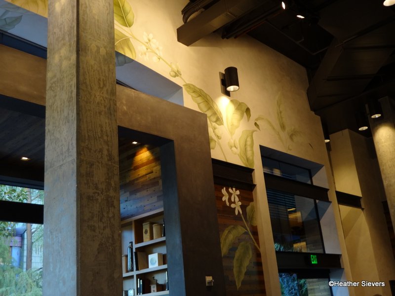 Other design elements include hand painted murals and a tree stump that was cut into a bench for seating. Starbucks wanted to bring in hand crafted elements that compliment their hand crafted beverages.