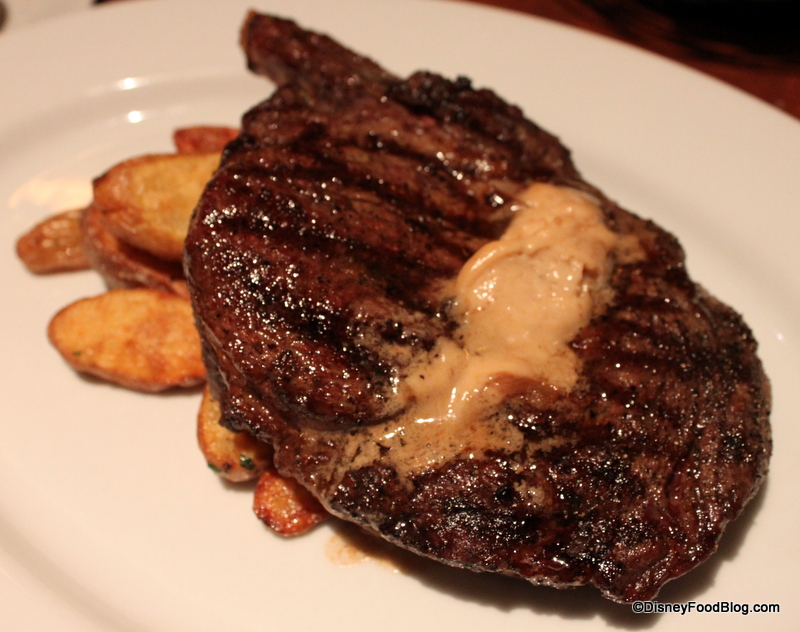 You can find another great steak on the Magic Kingdom Monorail loop at the Grand Floridian Cafe. This is a great option when you don’t have an advance dining reservation, but you’d like to enjoy a relaxing lunch. The Char-Crusted New York Strip Steak is the steak du jour right now.