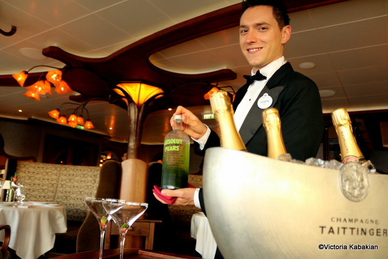 Although Remy also offers a Champagne brunch (at a $50 surcharge) on sea days, on this recent cruise we decided to splurge on dinner (a $75 surcharge plus $99 more if you add the wine experience, which we did not). First and foremost, the meal begins with a very special Champagne cocktail inspired by a very special character in the film, Colette.