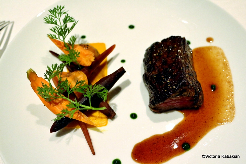 For our first course, we both selected the Wagyu carpaccio with ratatouille, basil coulis, 8 year aged Modena balsamic, and Parmesan crisps. The cold ratatouille is actually hidden underneath paper-thin layers of one of the world’s most famous beefs. The soft textures of the beef and ratatouille are offset by the Parmesan crisps, while the basil coulis and aged balsamic each provide contrasting nuances of herbaceous freshness and sweetness.