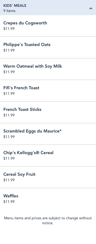 And here is a glimpse of the Kids Meals. I’m a little jealous, frankly, over the “Crepes du Cogsworth.”