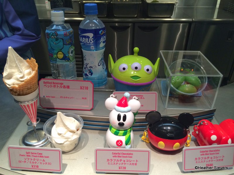 Let’s start over at the Tokyo Disneyland Hotel. There is a great little convenience store there that carries a wide variety of Disney themed food, snacks, drinks, candy, etc. Below are some of the adorable drinks that they had. The Snow White bottle is an apple & mango drink, the Tsum Tsum bottles are tea, and the Frozen ones are bottled water.