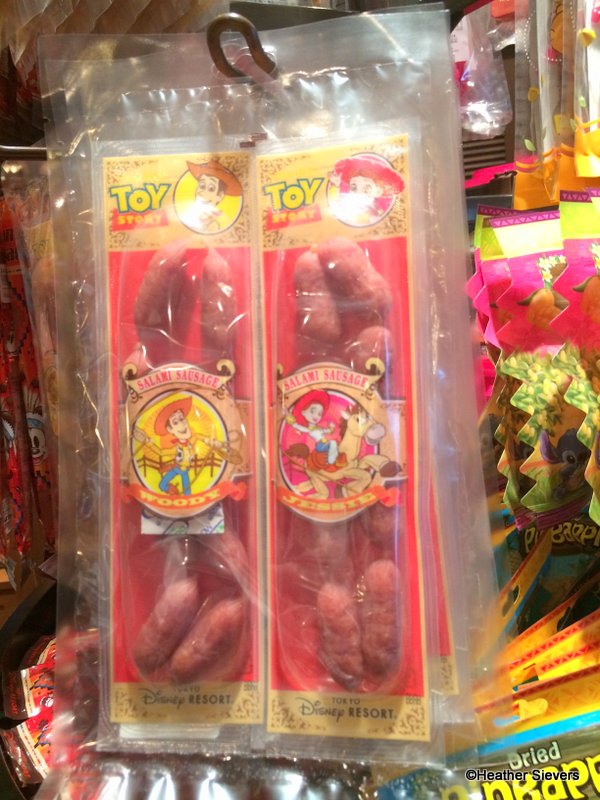 Let’s go into the parks. All of the below treats are pre-packaged souvenir treats that can be found around the Tokyo Disney Resort. First up are these crazy Toy Story “Salami Sausages.” I didn’t try them, but I did bring some home for friends. I haven’t heard a report back yet!