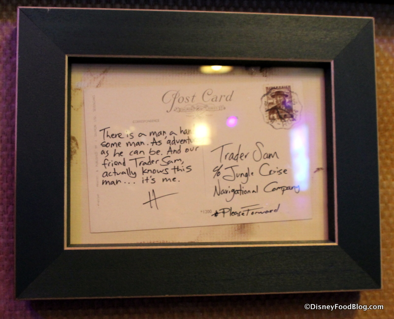 You’ve now entered Trader Sam’s “happy hideaway.” The story of the Grotto is told to us by Skip, Manager of the Jungle Cruise Navigational Company (just click the image below to enlarge). As head salesman of the jungle that we all know and love from the Jungle Cruise, Trader Sam discovered a passion for mixology as an extension of his professional interest in head-shrinking potions. As he traveled the globe for ingredients, he picked up many a souvenir and brought them back to the Grotto.