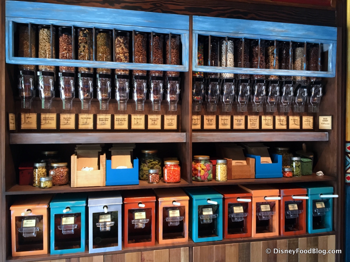 This place is the Animal Kingdom’s answer to Magic Kingdom’s Confectionery and Hollywood Studios’ Sweet Spells. As you enter from the Harambe Market side, you immediately see bulk bins. The sign says that it’s candy, but there are actually some healthier snacks here too, like almonds, granola, and yogurt-covered pretzels.