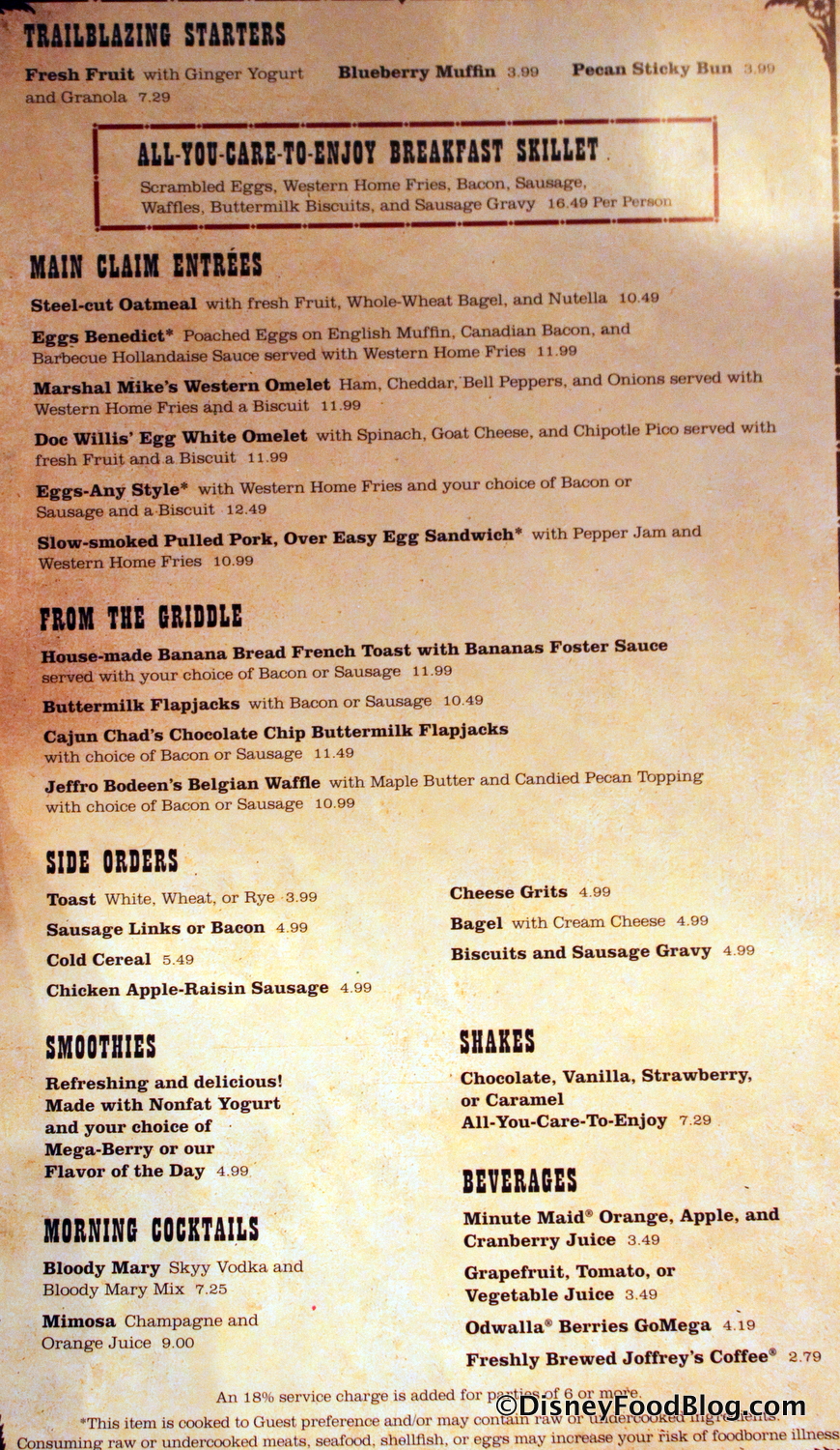 This skillet is relatively standard. There are no huge stand-outs, though the home fries are nicely spiced and the gravy tastes homemade. The Mickey Waffle is always a nice touch. But the biscuit, bacon, eggs, and sausage were typical of most Disney breakfasts (including counter service breakfasts). It’ll fill you up for a long day ahead, but there won’t be anything here that merits its own vacation scrapbook page.
