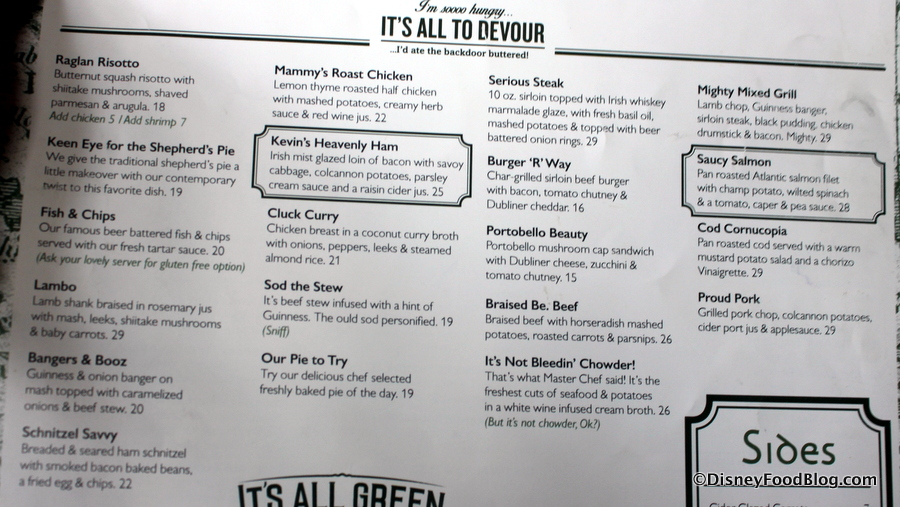 I never really thought of this as a lunch destination, but I’m glad to read after this that they don’t offer entertainment during the daytime. Even though some of these food offerings look interesting, IMO Raglan Road is meant to be enjoyed while it’s rowdy and noisy. One of my best Disney memories is when the cloggers came out and danced with our kids. Your mileage may vary.