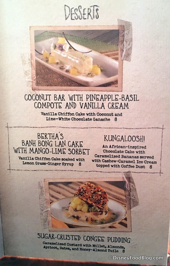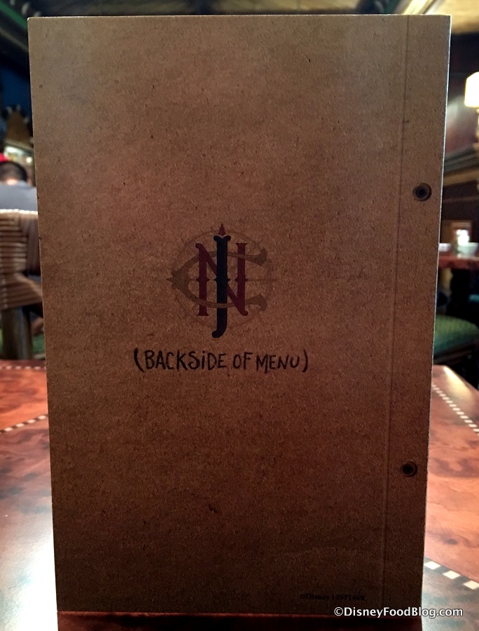 As promised, “World Famous Jungle Cuisine” is on the menu at the Skipper Canteen! So what does that mean, exactly? Let’s take a closer look, section by section! (By the way, the menu is the same for both lunch and dinner at the moment, and both meals are table service.)