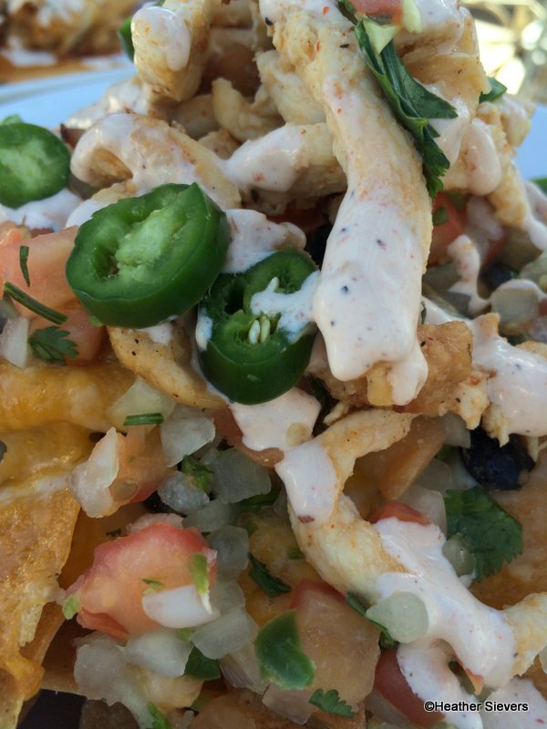 The cheese is perfectly melted with some slightly “burnt” cheese mixed in there too! Slightly burnt cheese is my favorite. You can see a perfectly burnt cheese/chip in the photo above (bottom left), yum! Anyone else like their nacho cheese a little crispy in spots??? The amount of chicken on the nachos is very generous and all of the produce was fresh. The Chipotle Crema drizzled on top, I could take or leave. I don’t think it adds a huge difference to the dish.