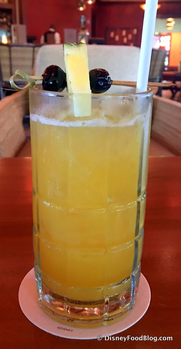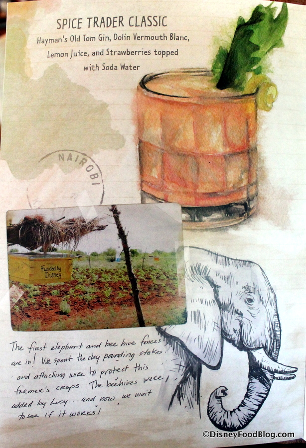 But it’s the drinks, of course, that take up the bulk of the menu, surrounded by the aforementioned notes and sketches from the park’s Imagineers. (You could seriously spend a chunk of an afternoon sitting and reading these stories and learning about the inspiration for special spots and attractions all over the park.) We’ll kick off our menu tour in Africa, with the Lamu Libation.