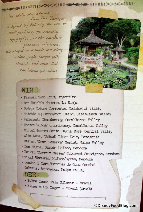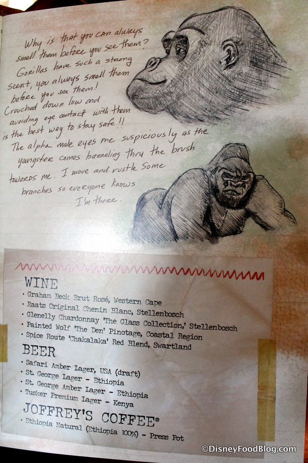 It’s not difficult to pick up on why they’re calling the menu book a travelog. The beverages are listed among pictures and travel notes written by the Imagineers when they were traveling to research and create the vision for Animal Kingdom. (As with all the following menu pictures, just click the image to enlarge.)