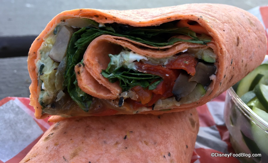 Seriously, if you love mushroom, you will love this – there was a ton tucked into our wrap. Also included are zucchini, sweet onion, and red bell pepper with a basil aioli. My one critique is that I found it to be a little soggy, honestly, but it did have a lot of flavor going for it thanks especially to the aioli.