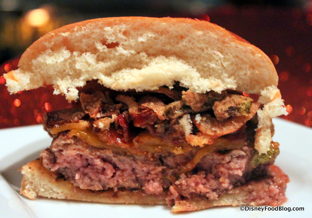 But check out this cross-section, with the Sci-Fi signature blend of beef which makes up the burger. This is NOT, thankfully, your typical well-done-to-the-point-of-dry Disney burger. Nope. And here’s WHY: The current chef at Sci-Fi recently came over from D-Luxe Burger in Disney Springs! So the Sci-Fi burger uses the same proprietary blend of beef that’s used at D-Luxe…which is amazingly delicious. And they KNOW not to cook burgers to within an inch of their lives. So YAY for burger rejuvenation here!