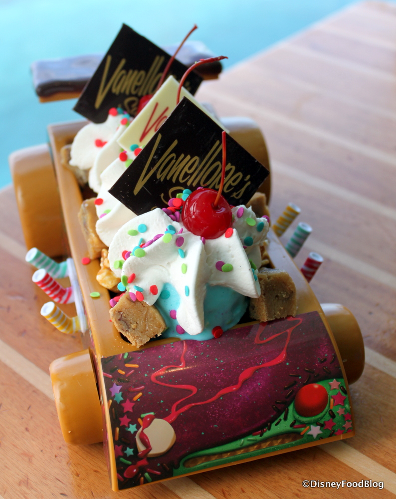 Once you’ve made your selections, the sundae is topped off with whipped cream, cherries, and squares of Vanellope’s chocolate (you get to choose milk chocolate or white chocolate). And did I mention it’s served in this incredible souvenir go-kart WITH WHEELS THAT ACTUALLY TURN (this is very important if you have a 4-year-old boy at home)?! Yes! (They’ll even wash this baby out for you when you’re done, so you can take your clean bowl home and, say, finish each day with a go-kart sundae of your own design!)
