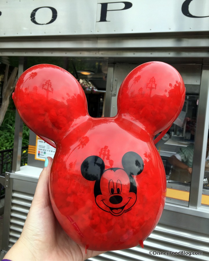 In Disneyland, they also came out in blue and purple (and we’ve seen elusive yellow ones, too!). For the time being, we’ve only spotted this one in red in Magic Kingdom — and at limited popcorn carts at that. We found them today, for instance, at the Storybook Circus popcorn cart and noticed them at just a few others. But they’re not at every cart. At least not yet!