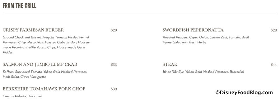 The “From the Grill” section includes a Crispy Parmesan Burger and a Salmon and Jumbo Lump Crab dish.