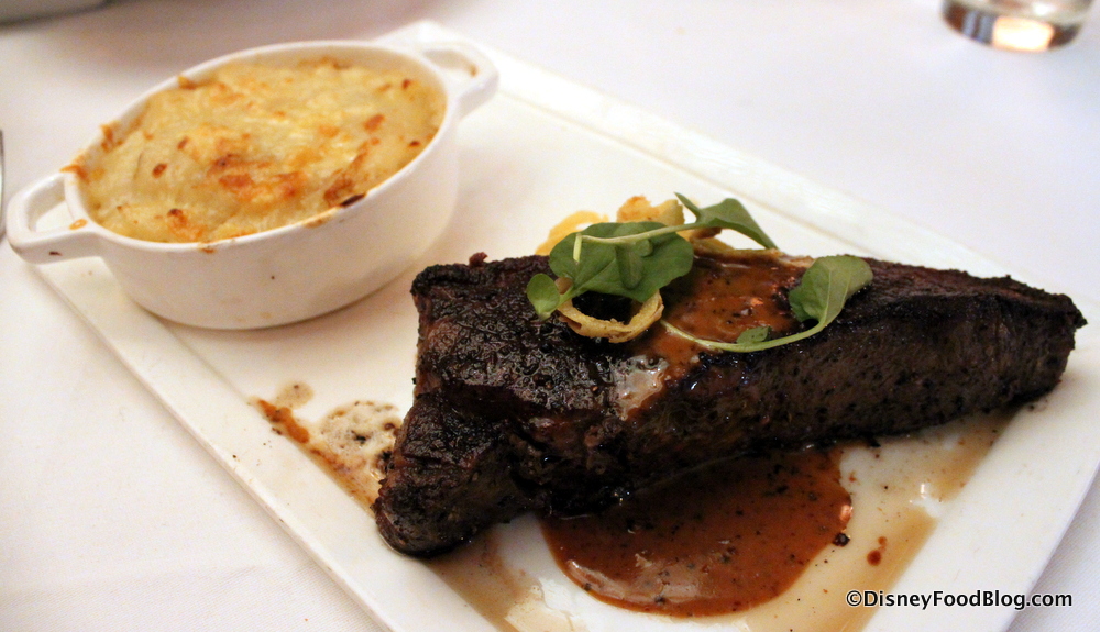 The 12-Ounce New York Strip Steak is an impressive piece of meat — and big enough to share if that 32-ounce Porterhouse seems excessive for you. 😉 This is served with Potato Gratin and a Peppercorn-Brandy Sauce — both of which are excellent partners for the beef. This is a great option.