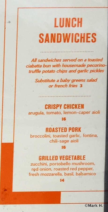 DFB Reader Mark H. enjoyed lunch at Terralina on its opening day. (Thanks again, Mark!) Though he ordered items also seen on the dinner menu (as the majority of the menu is the same), here’s a shot of some the Sandwiches available just for lunch.