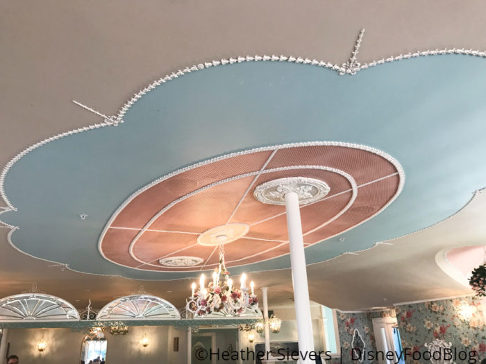 The ceiling is painted in pastels and features some neat moldings and curved shapes.