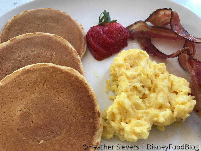 This is a serious portion of pancakes, y’all. Two massive Mickey-shaped beauties cooked perfectly and served with berries and bacon. Really good and really cute.