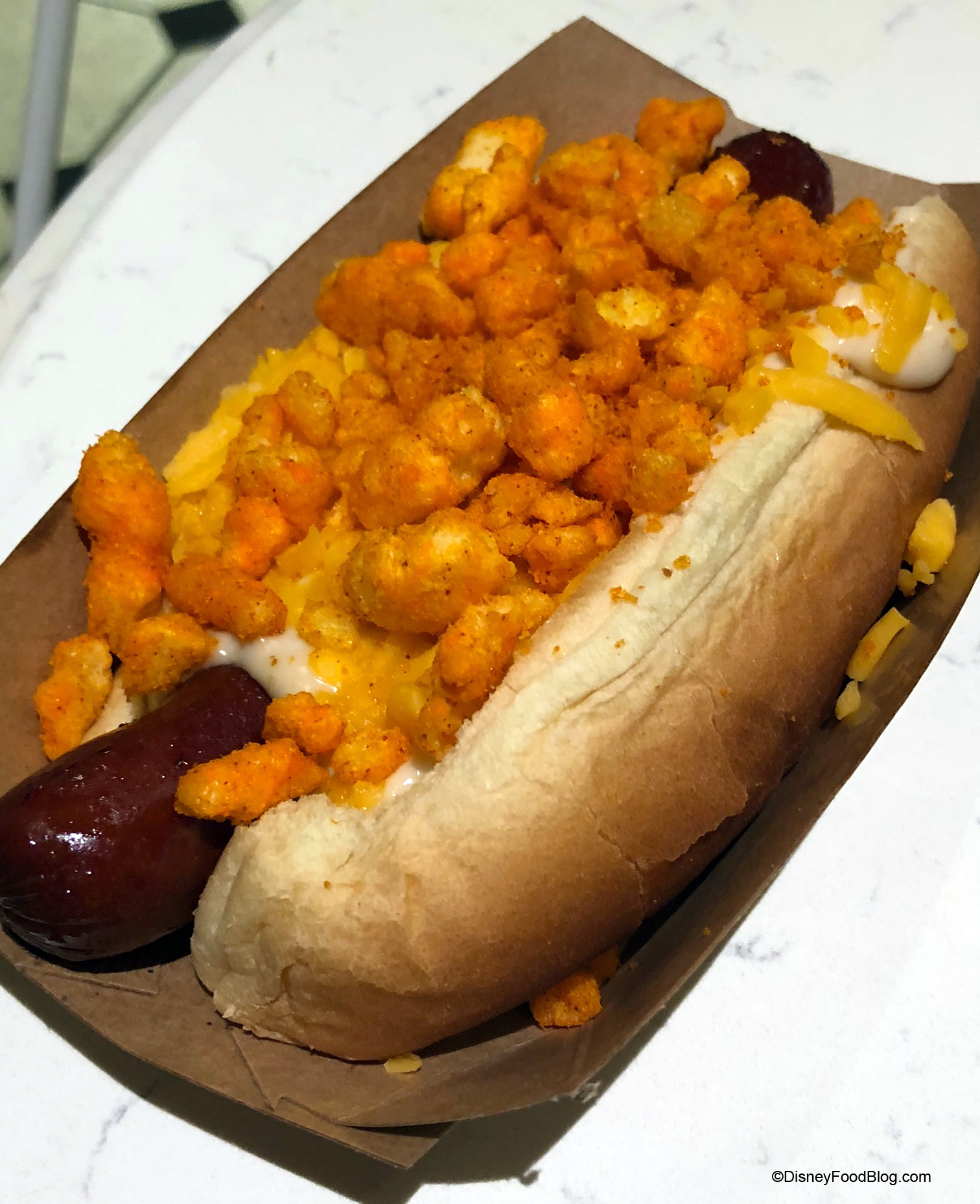 As you can see my Dog did match the marketing photos put out by Disney, so reality meets expectations as far as looks. So before trying the dog as a whole, I grabbed a puff from the top. I noticed the cheese puffs were stale and off-brand. Now, we are never promised Cheetos, but I was kind of surprised at the sogginess with these.