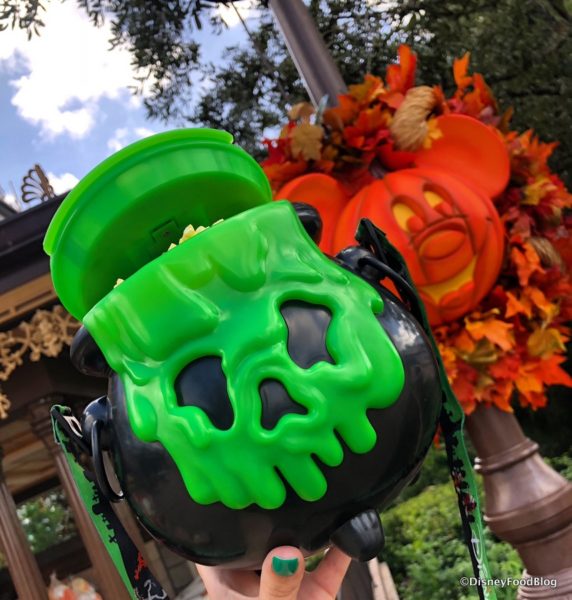 And though in Disney World the Green Poison Apple Stein was only announced for Animal Kingdom when the Halloween Souvenirs were revealed for this year, the Cauldron Bucket is appearing in all four Disney World parks and Disney Springs. We first saw it at the Main Street, U.S.A. Popcorn Cart in Magic Kingdom!