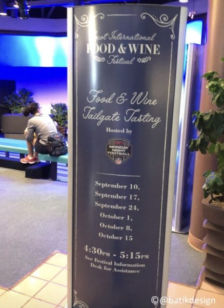 And, if you’re a football fan AND a foodie, there’s a new event made just for you! On select Monday afternoons through mid-October you can stop in the Festival Center for a Food and Wine Tailgate Tasting!