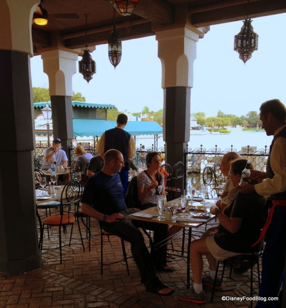 The restaurant perches on the edge of World Showcase Lagoon, and you can bet the designers made the most of it! There’s a large outdoor dining space that’s anchored from below by a pavered patio and from above by intricately cut metal lanterns that cast moody shadows on the spaces around them at night.
