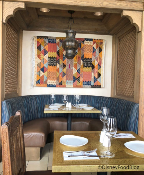 Large, semi-circle booths provide just about the coziest seating of any Walt Disney World table service restaurant. And check out that sort of batik fabric hung over the booth.