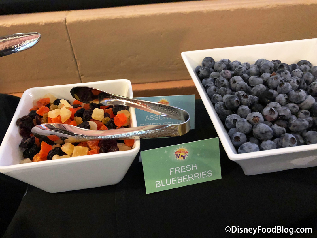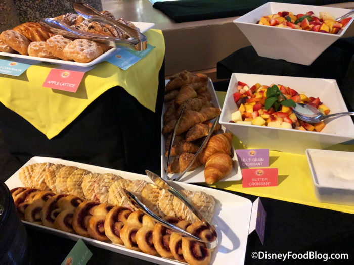 In addition to your entree, you’ll also have access to the Continental breakfast buffet. There is a selection of baked goods, fresh fruit, and yogurt parfaits on the buffet.