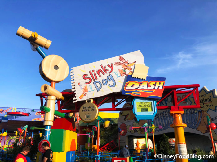 After breakfast, we headed over to Toy Story Land. We loved seeing 5 and 10 minute wait times posted! But, basically everything was a walk-on status. Look at that 5 minute wait time for Slinky Dog Dash and Alien Swirling Saucers!