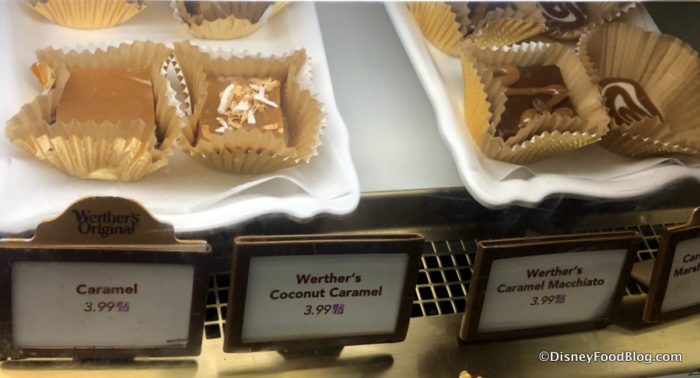 The Caramel, Coconut Caramel, and Caramel Macchiato Squares are $3.99 each and Disney Dining Plan snack credit eligible.