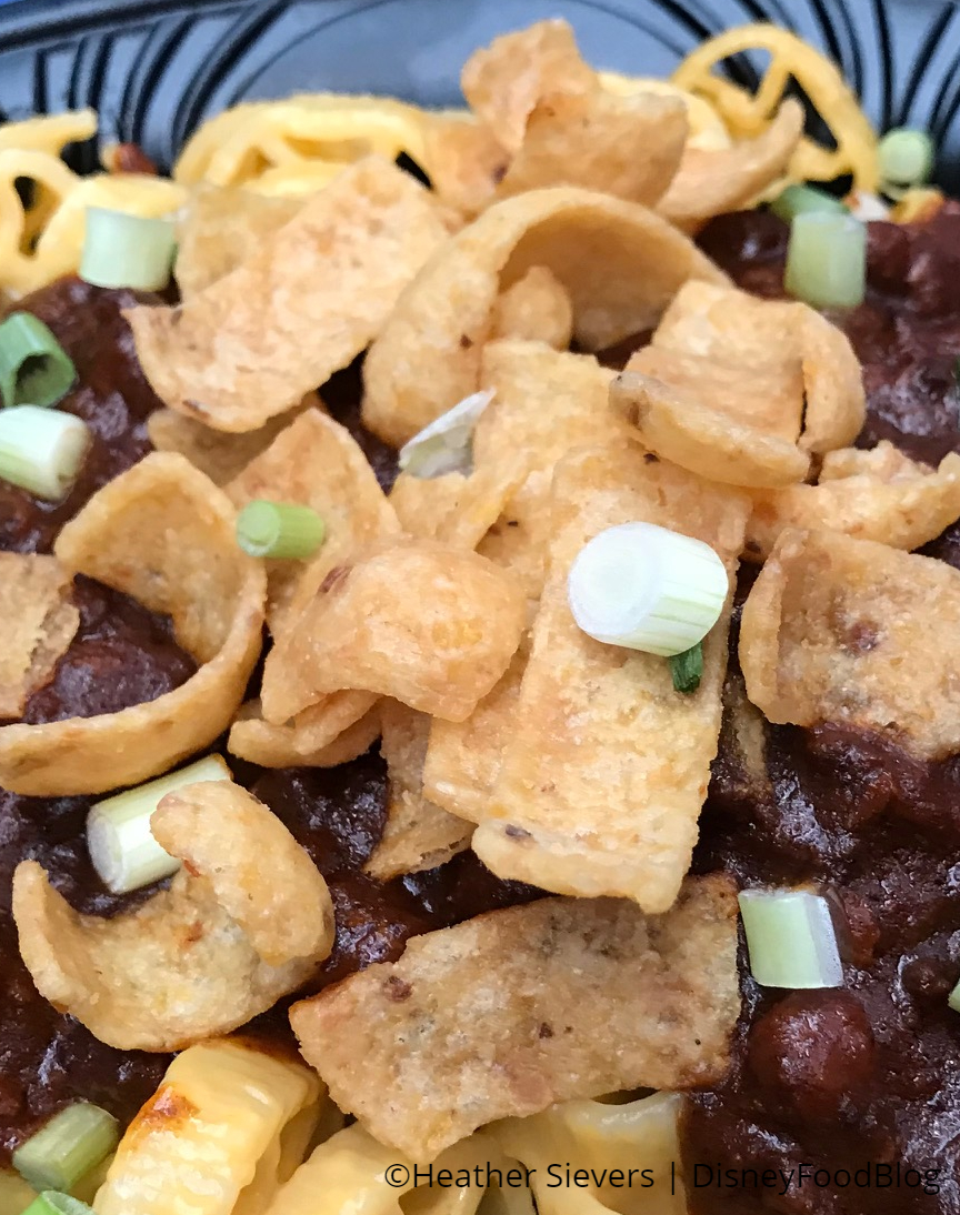 Cosmic Chili Pasta consists of pinwheel pasta, chili, jalapeno cheese sauce, and corn chips (Fritos!). It’s a thing of beauty to look at, and the flavors go really well together. Fritos and chili are sort of brothers from another mother, anyway, so it can’t hurt to put them on top of some fun pasta!