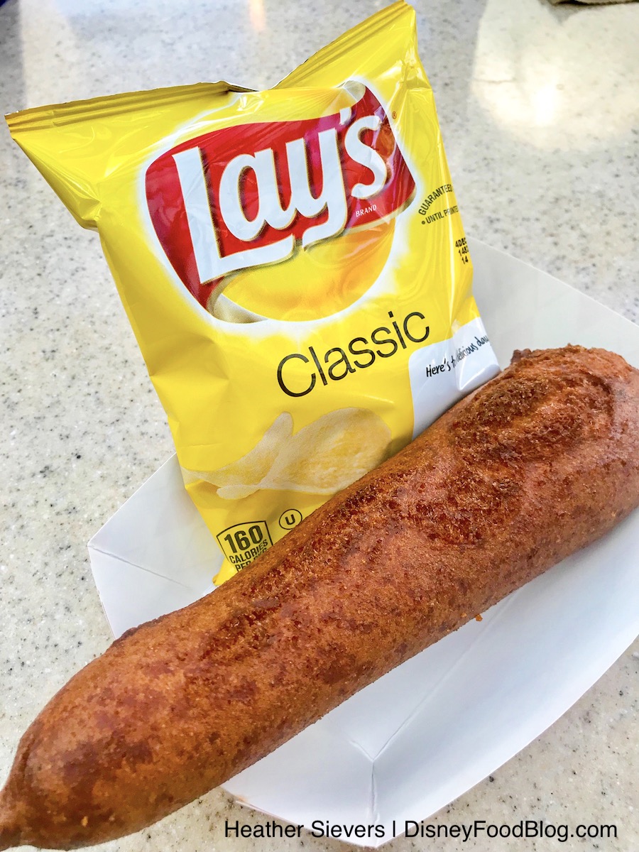 Each corn dog comes with your choice of a tangerine or a bag of chips. Bottled Coke, Diet Coke, Sprite, and Water are also available.