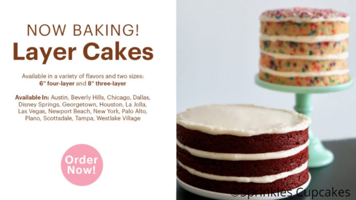 And we just spotted Layer Cakes on Sprinkles.com, and they’re available at Disney Springs! These so-called ‘naked’ cakes feature frosting between the layers (either four layers with 6″ or three layers with 8″ rounds!) and on top. Based on the announcement photo, some will also come with — wait for it! — sprinkles! We’re being instructed to “Order Now”, but we’re going to be on the lookout for these in the shop, too!